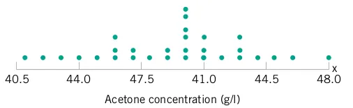 The engineer uses the standard rubber compound to produce eight O-rings in a development laboratory and measures the tensile strength of each specimen after immersion in a nitric acid solution at 30°C for 25 minutes. The tensile strengths (in psi) of the eight O-rings are 1030, 1035, 1020, 1049, 1028, 1026, 1019, and 1010.