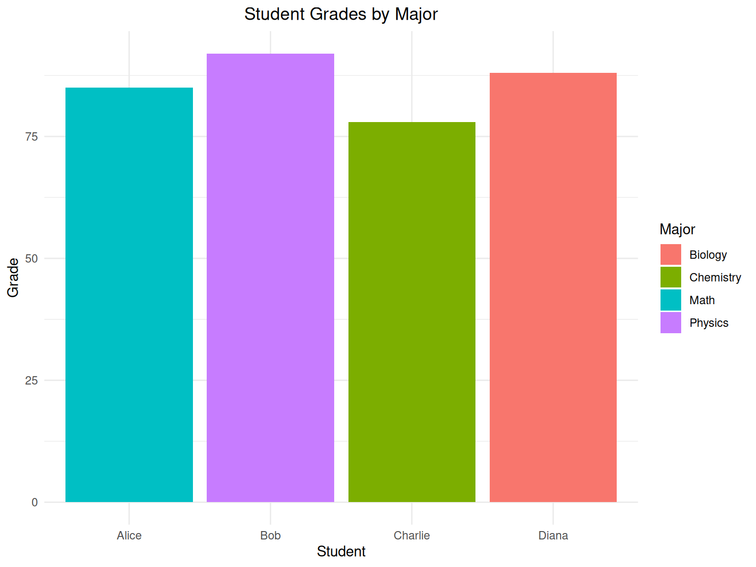 labs(title = "Student Grades by Major", x = "Student", y = "Grade", fill = "Major") +
