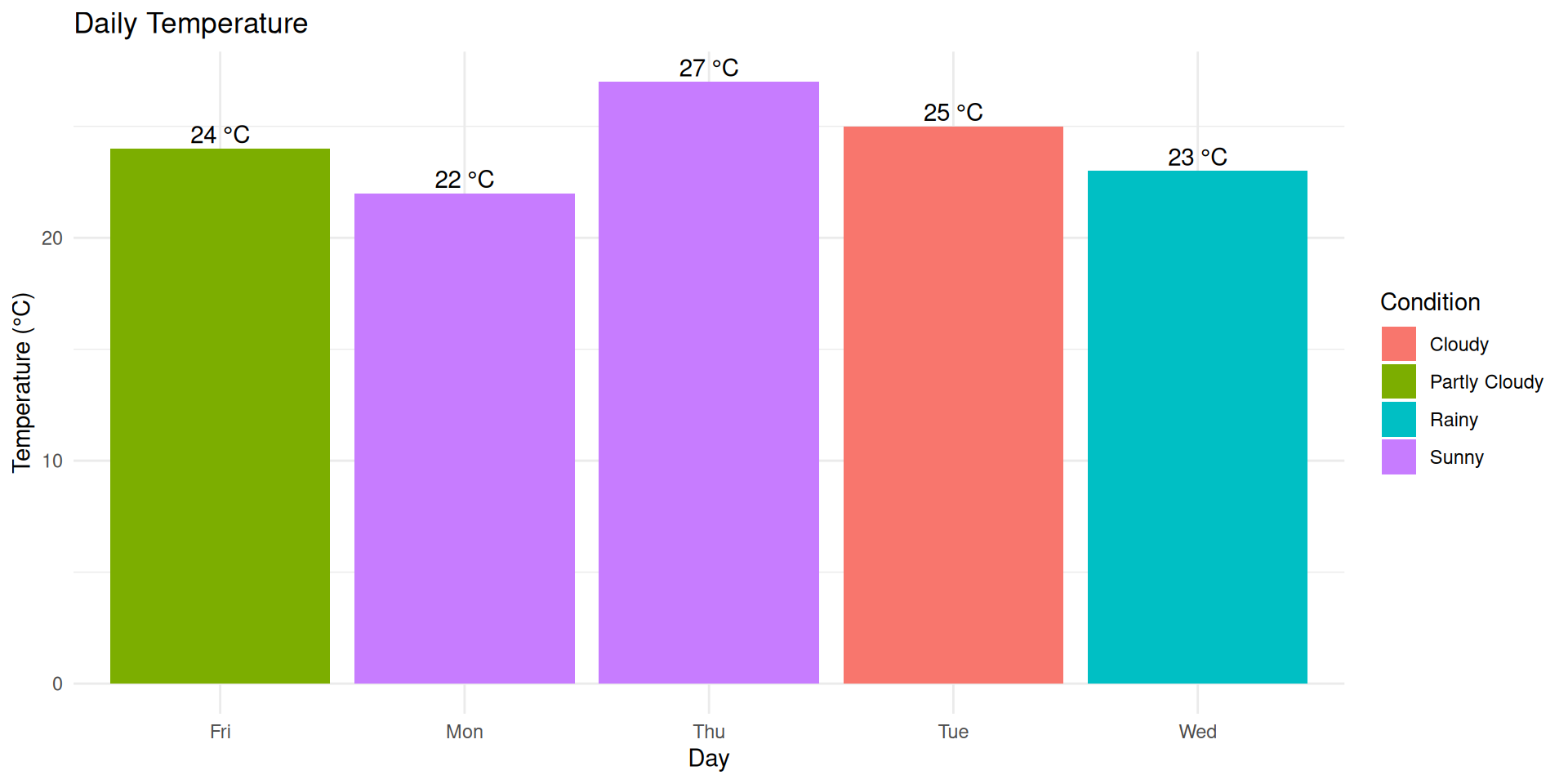 labs(title = "Daily Temperature", x = "Day", y = "Temperature (°C)", fill = "Condition") +
