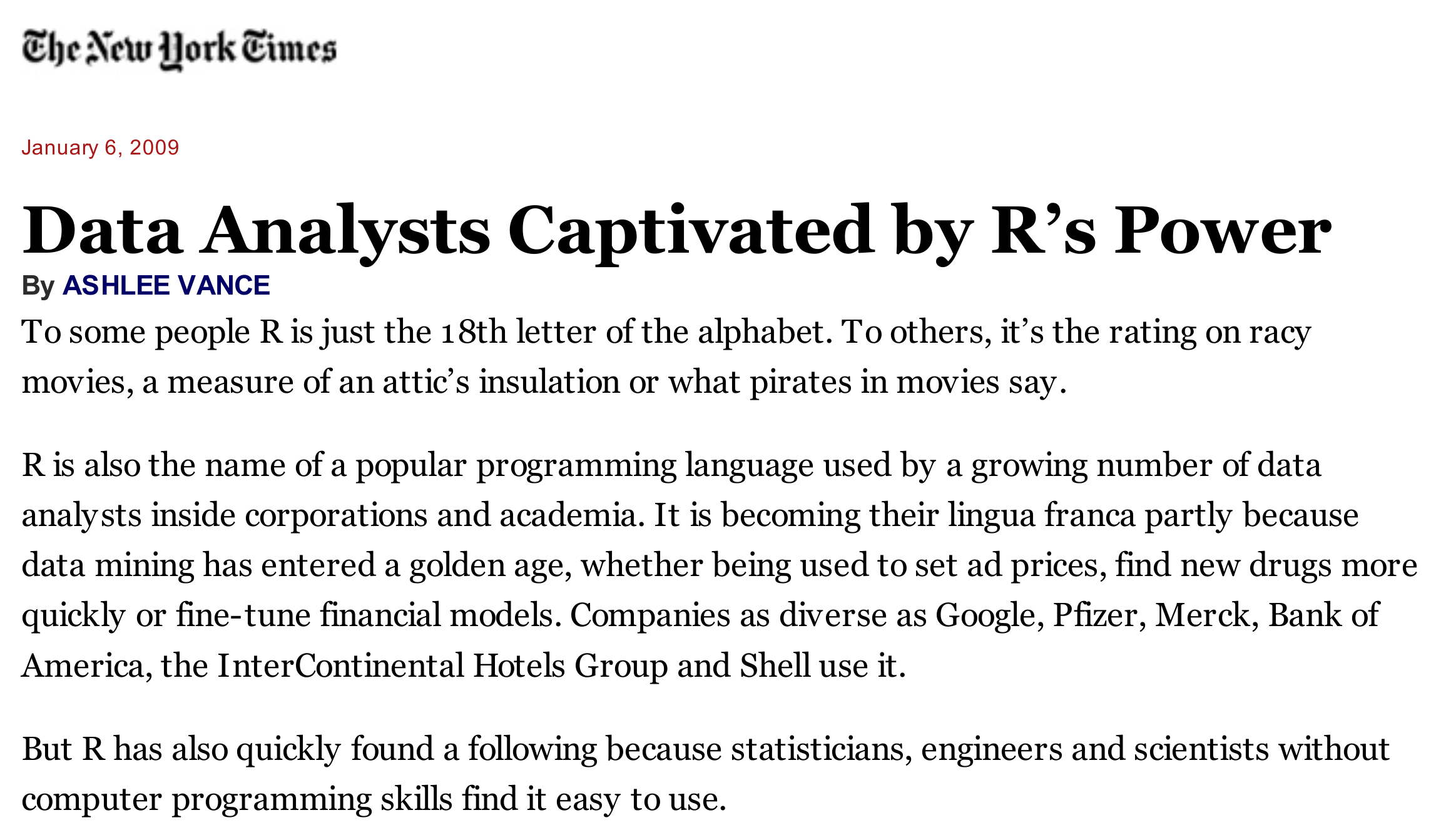 Vance, A. (2009). “Data analysts captivated by R’s power”. In: New York Times 6.